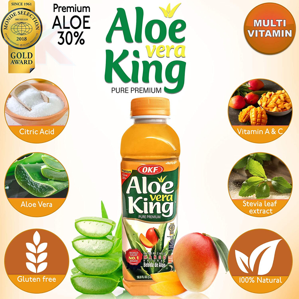 Összetevők: víz, aloe vera 30%, fruktóz, savanyúságot szabályozó anyag E327, E330, E331, mangó aroma, C-vitamin, sűrítő E418, színezék: E160a, E163.