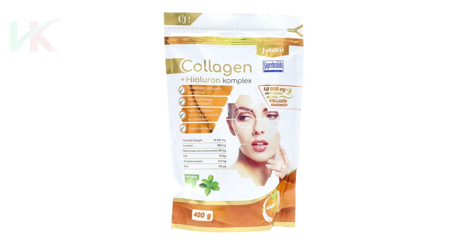 A JutaVit Kollagén + Hialuron komplex ananász ízű étrend-kiegészítő por olyan gondosan összeállított formula, amely támogatja a bőr, az ízületek és a kötőszövetek egészségét. A termék alapját a hidrolizált marha kollagén adja, amely a szervezet számára könnyen hasznosítható kollagén peptideket tartalmaz. A kollagén természetes módon megtalálható a bőrben, a csontokban és a porcokban, ezért fontos szerepet játszik a kötőszövetek rugalmasságának és stabilitásának fenntartásában.